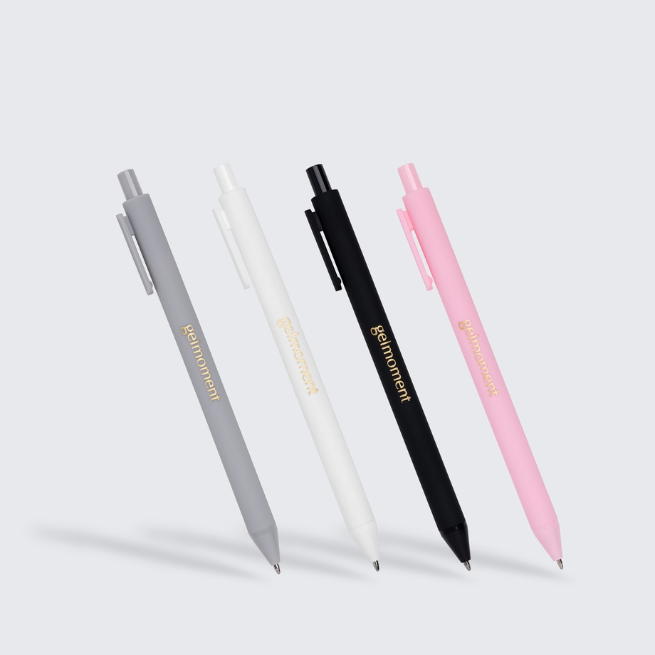 Pack of 4 pens in assorted colours. All monochrome, branded in gold with the Gelmoment logo. Black ink.